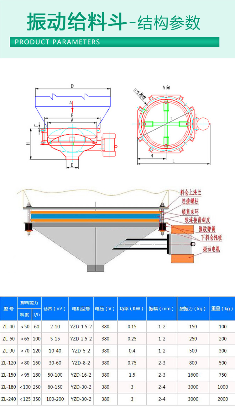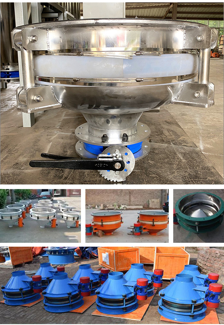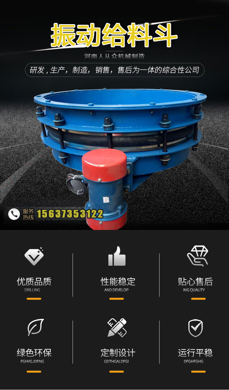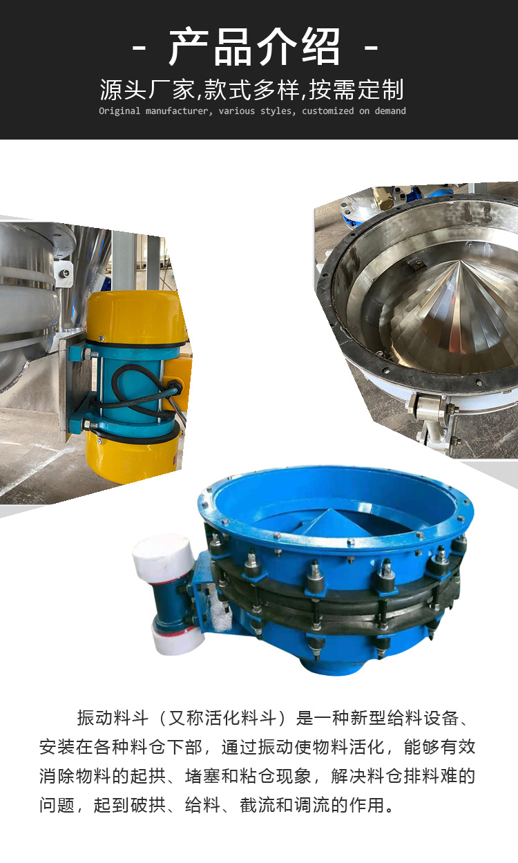 振動(dòng)給料斗又稱活化料斗,大多數(shù)料斗為圓盤式,通常安裝在各種料倉(cāng)的下部。通過(guò)振動(dòng)使物料活化,可以有效消除物料起拱、堵塞和粘附,解決料倉(cāng)卸料困難的問(wèn)題。