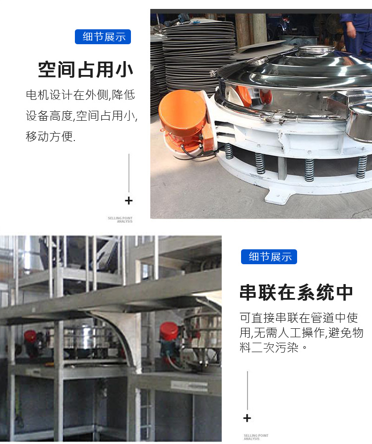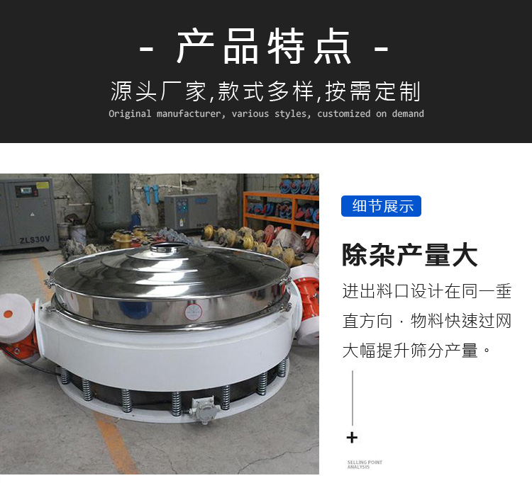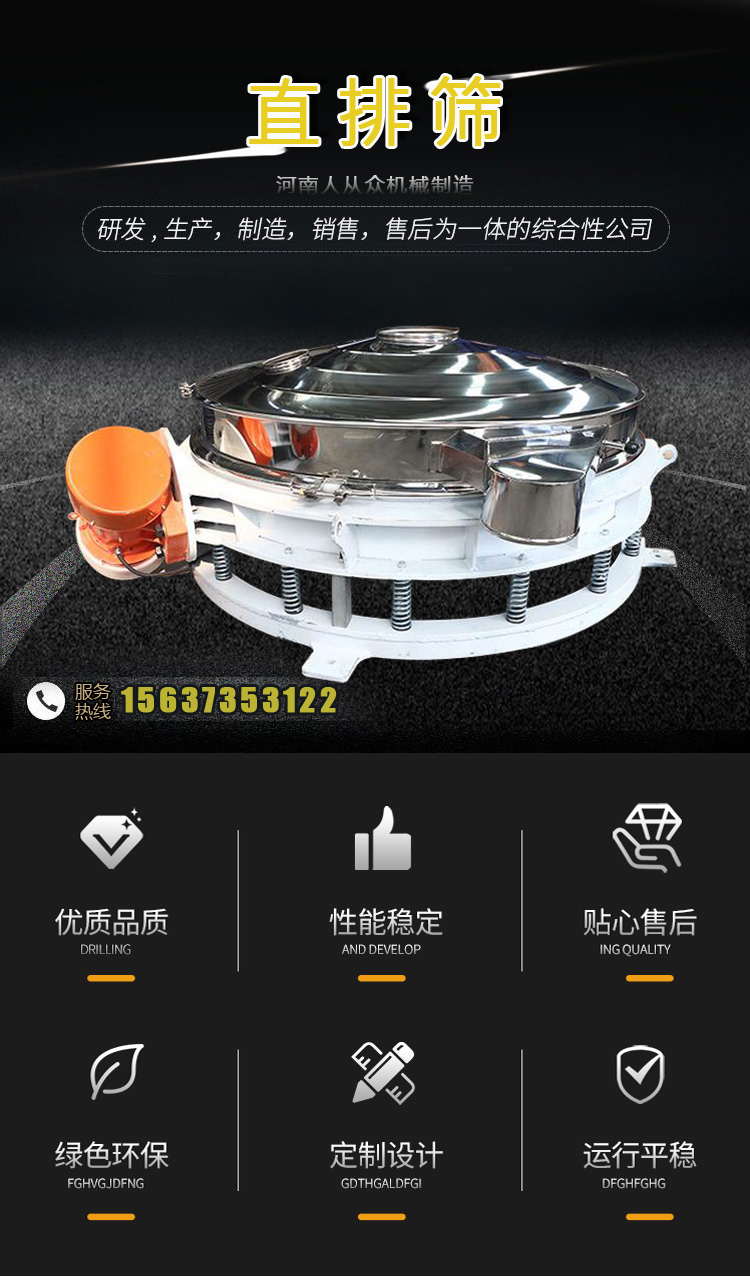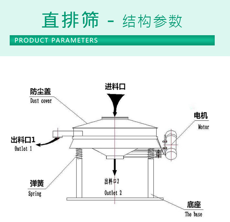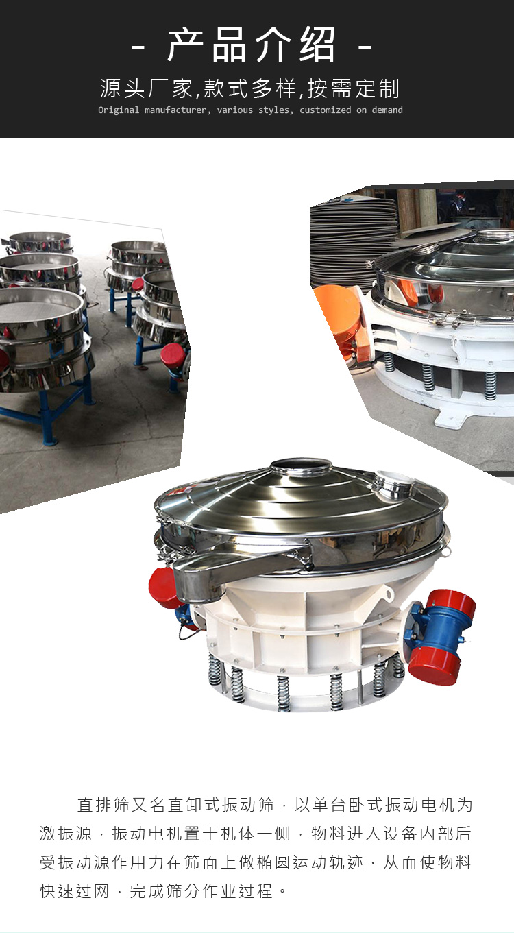 直排篩是以單個或兩個振動電機(jī)作為激振源,物料在振動源的作用下以橢圓軌跡運(yùn)行,可使物料快速通過篩網(wǎng),進(jìn)料口和出料口在同一垂直方向,極大提高了篩分效率,最終完成篩分過程。