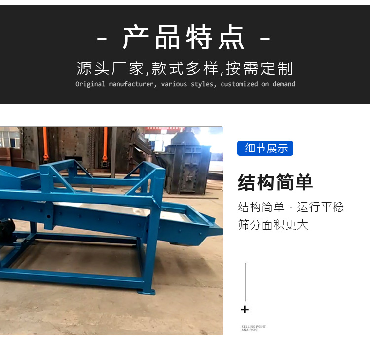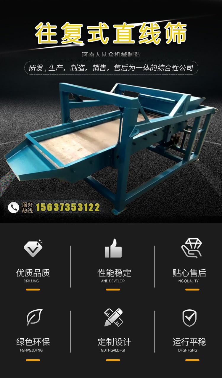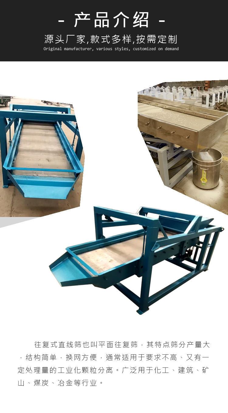 往復(fù)式直線篩也叫平面往復(fù)篩,其特點(diǎn)篩分產(chǎn)量大,換網(wǎng)方便,通常適用于要求不高、又有一定處理量的工業(yè)化顆粒分離。廣泛用于化工、建筑、礦山、煤礦等行業(yè)