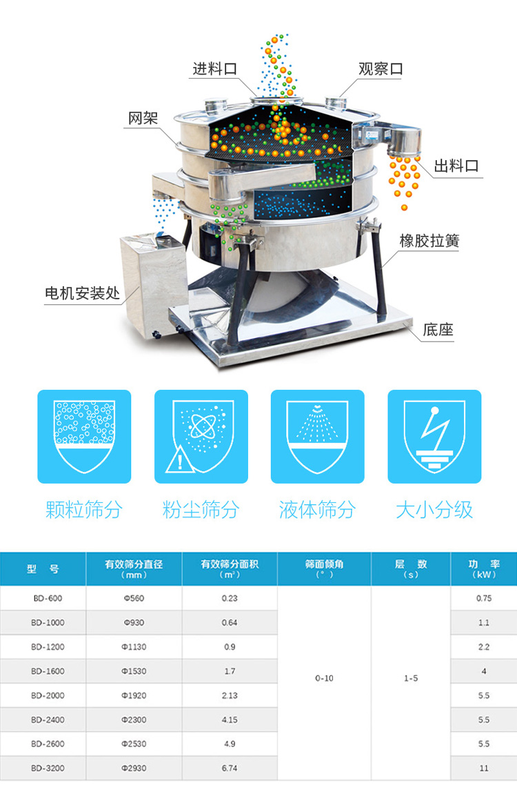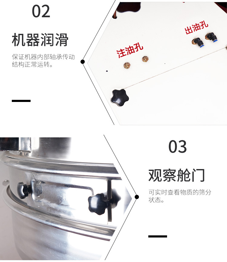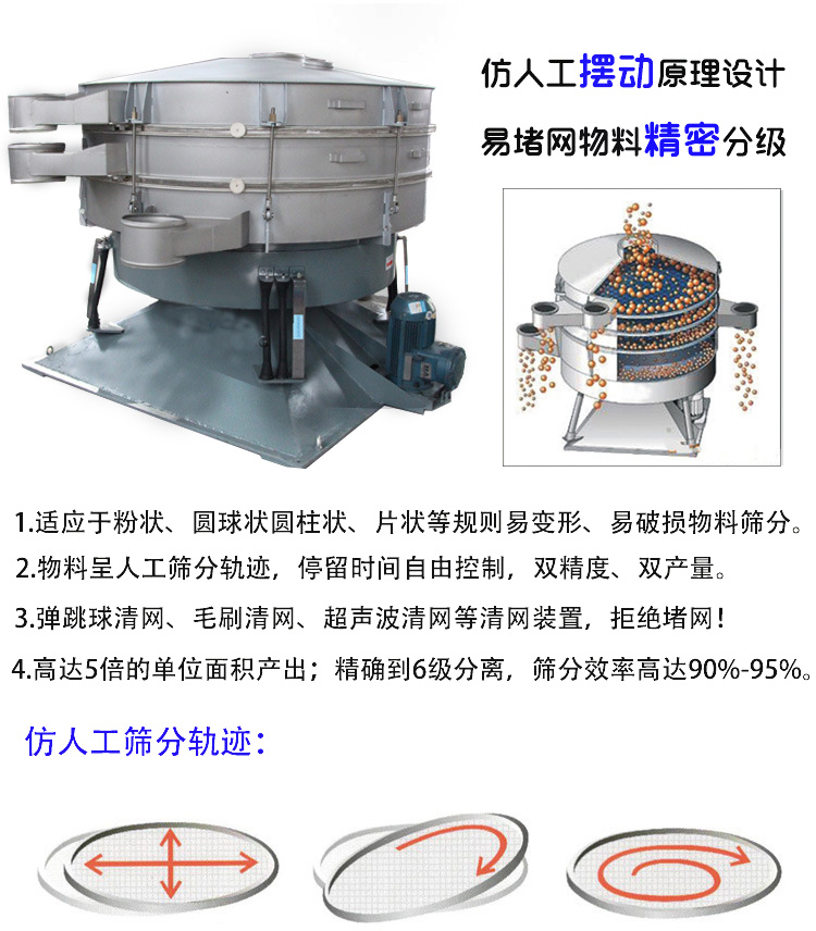 圓形工業過濾振動篩的仿人工設計極大程度上滿足了物料的高產、高效、高精度篩分需求,它是對原始篩分的機械模擬,相比普通旋振篩它有著高達幾倍的產量,篩分效率更是能達到90%以上,密閉除塵,操作安全。